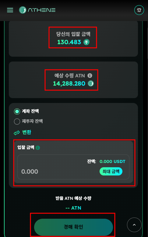 #메뉴 > 경매 참여 > 입찰 금액[입금한 USDT 입력] > 받을 ATN 예상 수량 확인 > 경매확인