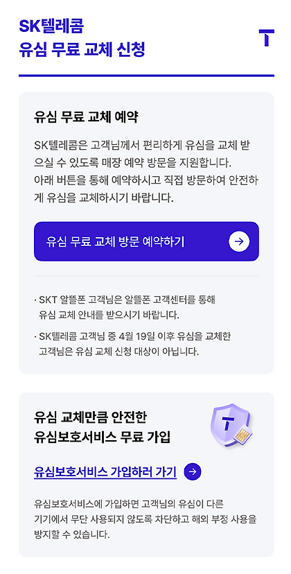 SKT 대리점에 직접 가시면 바로 교체해 주는데, 요즘은 워낙 사람들이 몰려서 예약하고 가는 걸 추천드려요.
