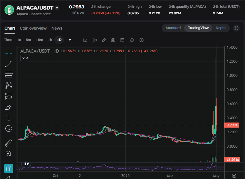 알파카의 경우도 비슷한 양상을 보였습니다. 상장폐지 발표 이후 오히려 매수세가 몰리면서 4월 25일 하루 거래량이 10억 달러를 넘었습니다. 그 결과 알파카는 4월 말까지 고점으로 치솟았으며, 발표 전 약 **$0.029 → $0.831 (약 39원 → 1,121원)**로 약 19배 상승했습니다.