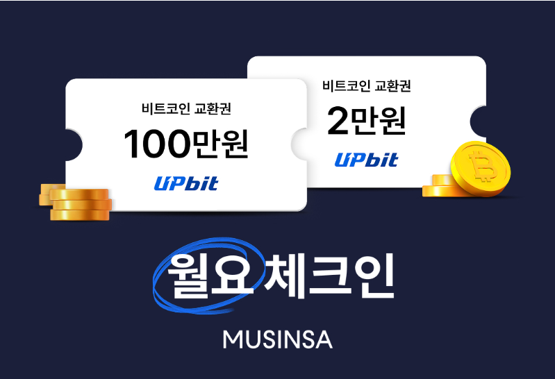 패션 플랫폼 무신사가 가상자산 거래소 업비트와 손잡고 파격적인 이벤트를 진행합니다. 바로, 4월 28일 단 하루, 무신사 앱에서 ‘월요 체크인’ 이벤트를 통해 총 20억 원 규모의 비트코인 교환권을 선착순으로 증정하는 행사인데요. 이번 이벤트는 패션과 가상자산이라는 전혀 다른 분야의 협업으로 더욱 주목받고 있습니다.이벤트 내용일시: 2025년 4월 28일(월) 오전 11시 ~ 자정까지참여 방법: 무신사 앱 '월요 체크인' 페이지 → '이벤트 응모하기' 클릭방식: 선착순 경품 지급 (조기 마감 가능) 이벤트 참여 방법1. 무신사 가입[링크 클릭] / 친구초대 쿠폰 5,000원 지급 + 첫 구매 쿠폰 지급 친구초대 | 무신사 www.musinsa.com2. 쿠폰 발급받기 [링크 클릭] 사은품전ㅣ월요 체크인-..