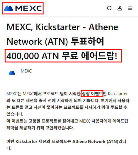 MEXC, Kickstarter - Athene Network (ATN) 투표하여 400,000 ATN 무료 에어드랍!Athene Network (ATN) 소개Athene Network는 인공지능(AI)과 블록체인 기술을 통합하여 데이터 혁신과 탈중앙화 솔루션을 이끄는 선도적인 플랫폼입니다. 2023년에 설립된 이 플랫폼은 다국어 소셜 미디어 데이터 수집 네트워크를 구축하는 데 주력하고 있으며, 전 세계 사용자들이 탈중앙화 접근 방식을 통해 데이터 채굴 및 AI 학습에 참여할 수 있도록 지원합니다.총 공급량: 2,100,000,000 ATNKickstarter 참가 방법사용자는 MX를 스테이킹하여 투표에 참여하고 무료 프로젝트 에어드랍을 받을 수 있습니다. 커밋할 수 있는 MX의 최대 수량은 스냅샷 시간..